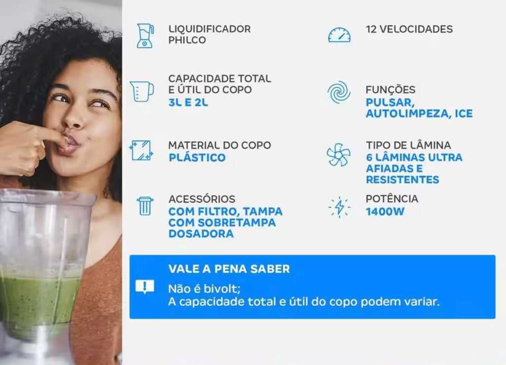 Com 1400W de potência e até 12 velocidades, o Philco PLQ2100PI garante alto desempenho para triturar gelo, frutas, legumes e muito mais. Seu copo de 3L (útil 2L) é feito de plástico resistente que não retém odores, e acompanha filtro com sobretampa dosadora, ideal para sucos e preparos mais práticos.